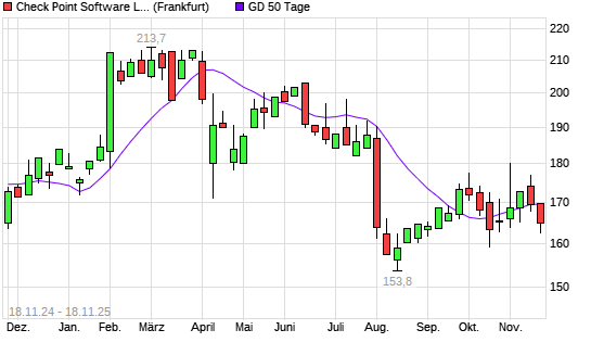 Mit dem Rücksetzer auf 166,05 EUR hat die Check Point Software-Aktie am 17.11.2025 die 50-Tage-Linie nach unten gekreuzt.