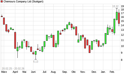 Mit dem Anstieg auf 17,79 EUR hat die Chemours Company-Aktie (ISIN US1638511089) am 19.02.2026 ein neues 12-Monats-Hoch erreicht und damit den Kurs vom 12.02.2026 eingestellt.