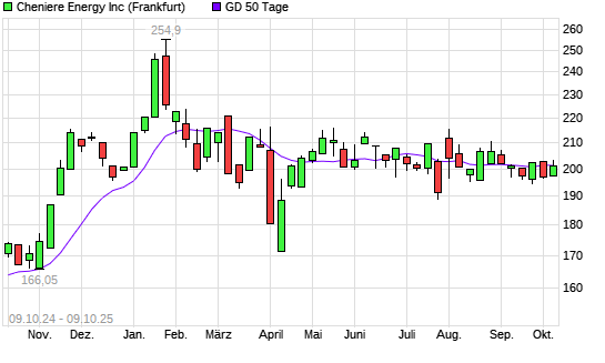 Mit dem Anstieg auf 201,90 EUR hat die Cheniere Energy-Aktie am 08.10.2025 die 50-Tage-Linie nach oben gekreuzt.