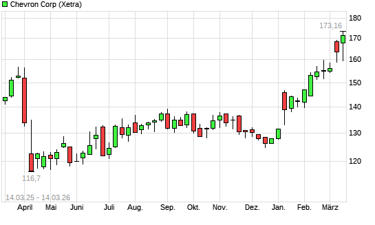 Mit dem Anstieg auf 172,34 EUR hat die Chevron-Aktie (ISIN US1667641005) am 13.03.2026 ein neues 3-Jahres-Hoch erreicht und damit den Kurs vom 12.03.2026 eingestellt.