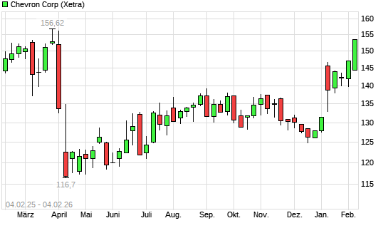 Mit dem Anstieg auf 151,14 EUR hat die Chevron-Aktie (ISIN US1667641005) am 03.02.2026 ein neues 6-Monats-Hoch erreicht und damit den Kurs vom 30.01.2026 eingestellt.