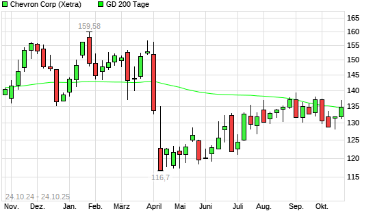 Mit dem Anstieg auf 136,00 EUR hat die Chevron-Aktie am 23.10.2025 die 200-Tage-Linie nach oben gekreuzt.