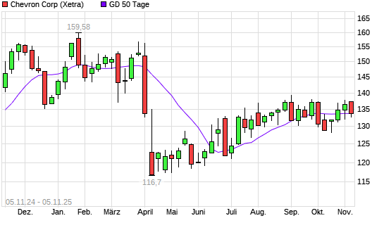 Mit dem Rücksetzer auf 133,58 EUR hat die Chevron-Aktie am 04.11.2025 die 50-Tage-Linie nach unten gekreuzt.