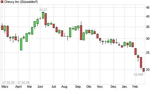 Mit dem Rücksetzer auf 20,00 EUR hat die Chewy-Aktie (ISIN US16679L1098) am 16.02.2026 ein neues 12-Monats-Tief erreicht und damit den Kurs vom 13.02.2026 eingestellt.