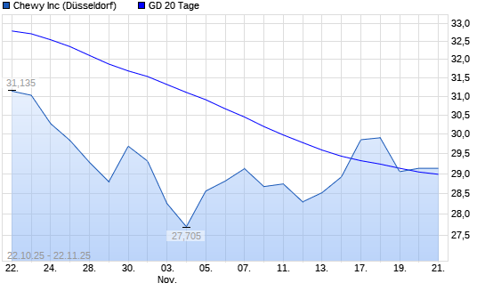 Mit dem Rücksetzer auf 28,35 EUR hat die Chewy-Aktie am 21.11.2025 die 20-Tage-Linie nach unten gekreuzt.