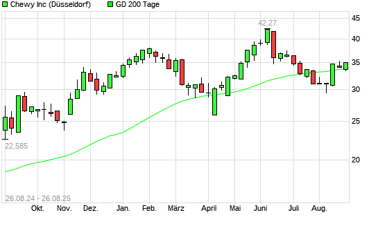 Mit dem Rücksetzer auf 33,14 EUR hat die Chewy-Aktie am 25.08.2025 die 200-Tage-Linie nach unten gekreuzt.