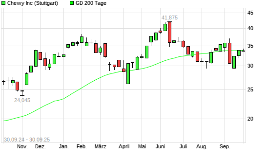 Mit dem Rücksetzer auf 33,35 EUR hat die Chewy-Aktie am 29.09.2025 die 200-Tage-Linie nach unten gekreuzt.