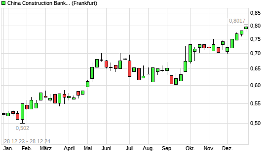 Mit dem Anstieg auf 0,80 EUR hat die China Construction Bank-Aktie (ISIN CNE1000002H1) am 27.12.2024 ein neues 5-Jahres-Hoch erreicht und damit den Kurs vom 27.12.2019 eingestellt.