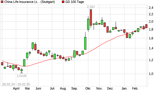 Mit dem Anstieg auf 1,89 EUR hat die China Life Insurance-Aktie am 24.02.2025 die 100-Tage-Linie nach oben gekreuzt.