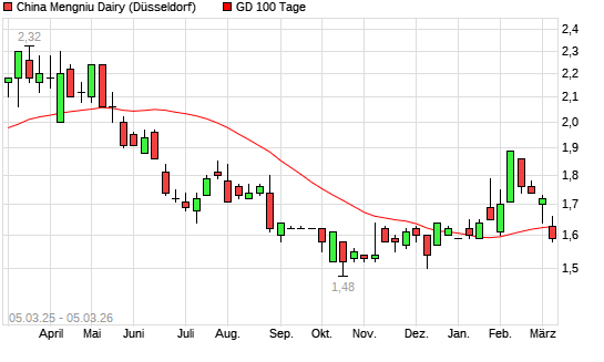 Mit dem Anstieg auf 1,65 EUR hat die China Mengniu Dairy-Aktie am 04.03.2026 die 100-Tage-Linie nach oben gekreuzt.
