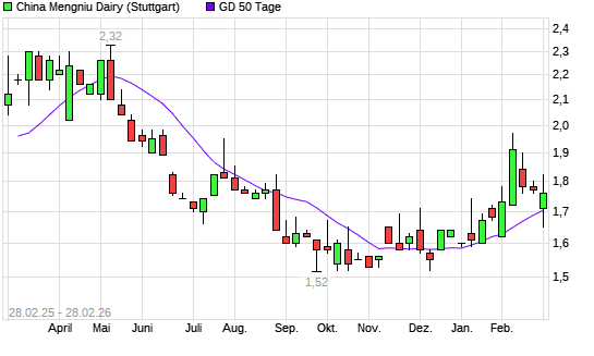 Mit dem Anstieg auf 1,69 EUR hat die China Mengniu Dairy-Aktie am 27.02.2026 die 50-Tage-Linie nach oben gekreuzt.