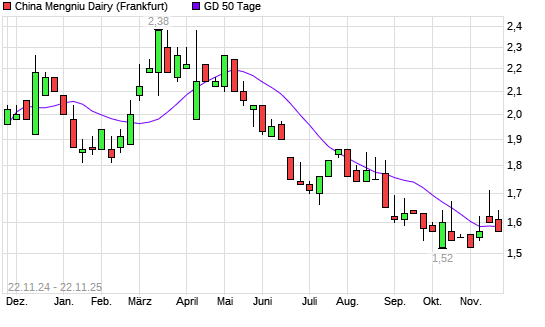 Mit dem Rücksetzer auf 1,57 EUR hat die China Mengniu Dairy-Aktie am 21.11.2025 die 50-Tage-Linie nach unten gekreuzt.