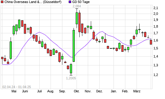 Mit dem Rücksetzer auf 1,62 EUR hat die China Overseas Land & Investment-Aktie am 31.03.2025 die 50-Tage-Linie nach unten gekreuzt.