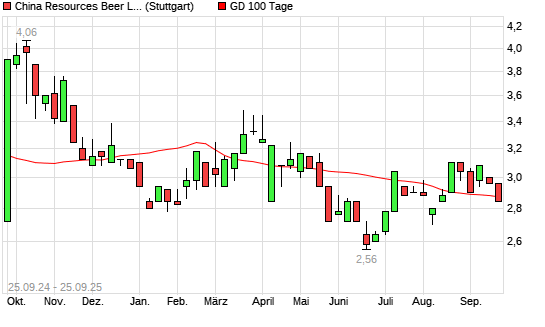 Mit dem Anstieg auf 2,96 EUR hat die China Resources Beer-Aktie am 24.09.2025 die 100-Tage-Linie nach oben gekreuzt.