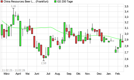 Mit dem Anstieg auf 2,98 EUR hat die China Resources Beer-Aktie am 10.02.2026 die 200-Tage-Linie nach oben gekreuzt.