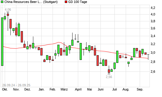 Mit dem Rücksetzer auf 2,84 EUR hat die China Resources Beer-Aktie am 25.09.2025 die 100-Tage-Linie nach unten gekreuzt.