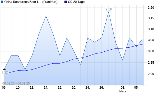 Mit dem Rücksetzer auf 3,02 EUR hat die China Resources Beer-Aktie am 05.03.2025 die 20-Tage-Linie nach unten gekreuzt.