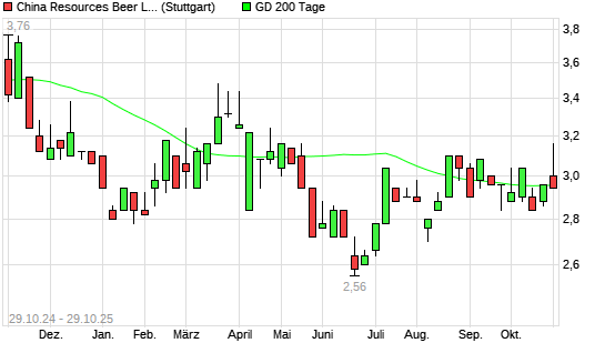 Mit dem Rücksetzer auf 2,96 EUR hat die China Resources Beer-Aktie am 28.10.2025 die 200-Tage-Linie nach unten gekreuzt.