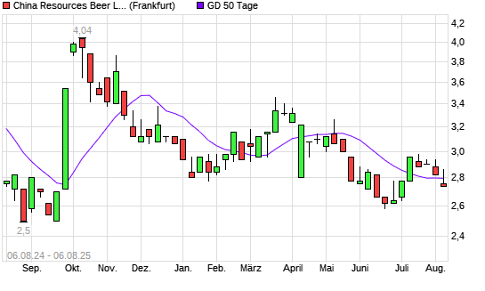 Mit dem Rücksetzer auf 2,74 EUR hat die China Resources Beer-Aktie am 05.08.2025 die 50-Tage-Linie nach unten gekreuzt.
