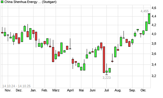 Mit dem Anstieg auf 4,34 EUR hat die China Shenhua Energy-Aktie (ISIN CNE1000002R0) am 13.10.2025 ein neues 12-Monats-Hoch erreicht und damit den Kurs vom 10.10.2025 eingestellt.