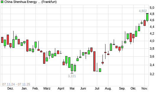 Mit dem Anstieg auf 4,70 EUR hat die China Shenhua Energy-Aktie (ISIN CNE1000002R0) am 06.11.2025 ein neues 12-Monats-Hoch erreicht und damit den Kurs vom 30.10.2025 eingestellt.
