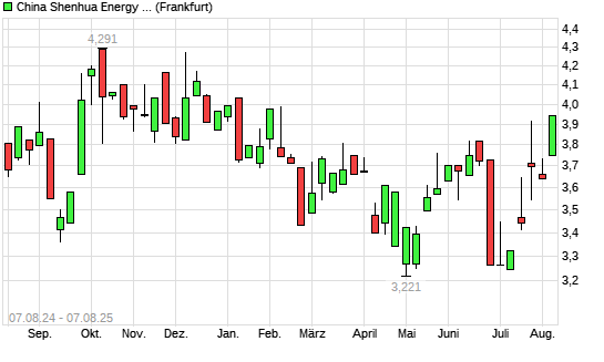 Mit dem Anstieg auf 3,93 EUR hat die China Shenhua Energy-Aktie (ISIN CNE1000002R0) am 06.08.2025 ein neues 6-Monats-Hoch erreicht und damit den Kurs vom 22.07.2025 eingestellt.