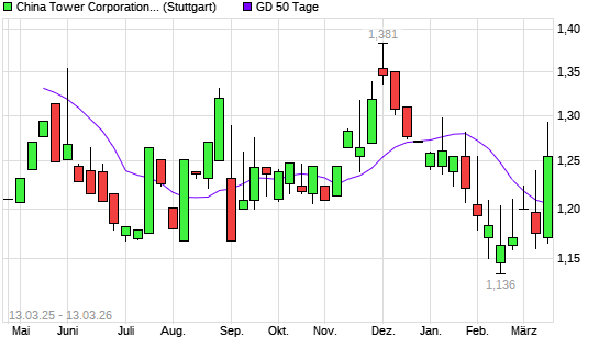 Mit dem Anstieg auf 1,24 EUR hat die China Tower Corp-Aktie am 12.03.2026 die 50-Tage-Linie nach oben gekreuzt.