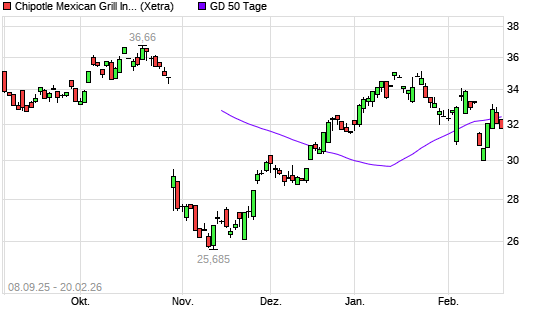 Mit dem Rücksetzer auf 32,20 EUR hat die Chipotle Mexican Grill-Aktie am 19.02.2026 die 50-Tage-Linie nach unten gekreuzt.