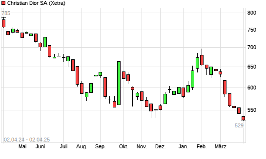 Mit dem Rücksetzer auf 526,00 EUR hat die Christian Dior-Aktie (ISIN FR0000130403) am 01.04.2025 ein neues 12-Monats-Tief erreicht und damit den Kurs vom 13.11.2024 eingestellt.