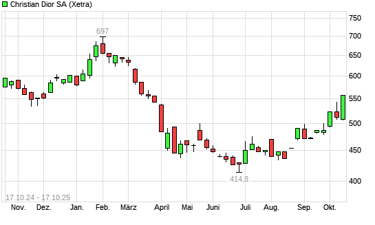 Mit dem Anstieg auf 554,50 EUR hat die Christian Dior-Aktie (ISIN FR0000130403) am 16.10.2025 ein neues 6-Monats-Hoch erreicht und damit den Kurs vom 09.10.2025 eingestellt.