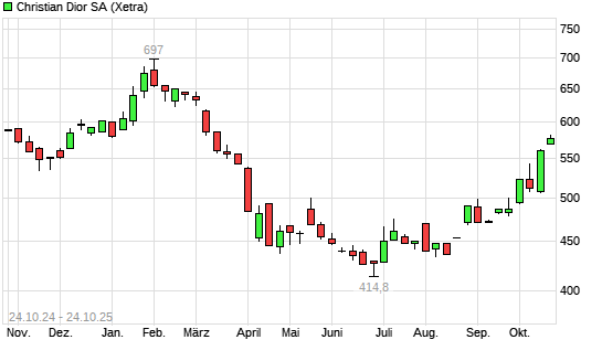 Mit dem Anstieg auf 579,50 EUR hat die Christian Dior-Aktie (ISIN FR0000130403) am 23.10.2025 ein neues 6-Monats-Hoch erreicht und damit den Kurs vom 21.10.2025 eingestellt.