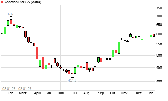 Mit dem Anstieg auf 607,00 EUR hat die Christian Dior-Aktie (ISIN FR0000130403) am 07.01.2026 ein neues 6-Monats-Hoch erreicht und damit den Kurs vom 05.01.2026 eingestellt.