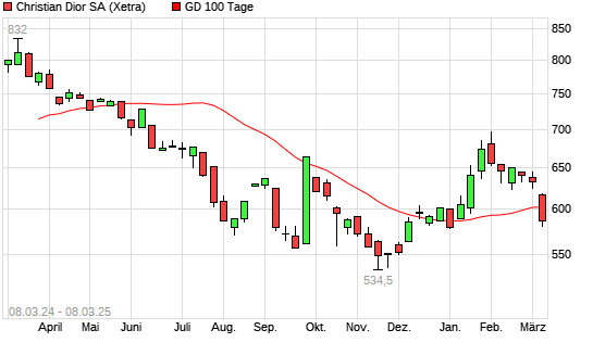 Mit dem Rücksetzer auf 592,50 EUR hat die Christian Dior-Aktie am 07.03.2025 die 100-Tage-Linie nach unten gekreuzt.