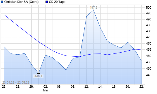 Mit dem Rücksetzer auf 458,40 EUR hat die Christian Dior-Aktie am 22.05.2025 die 20-Tage-Linie nach unten gekreuzt.