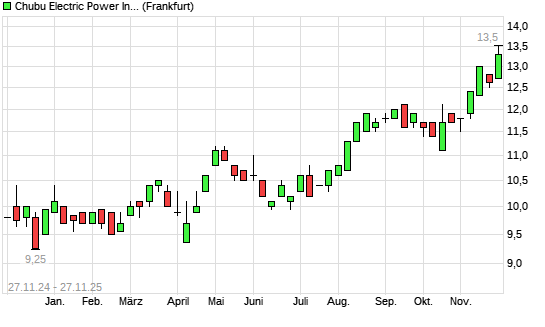 Mit dem Anstieg auf 13,50 EUR hat die Chubu Electric Power-Aktie (ISIN JP3526600006) am 26.11.2025 ein neues 5-Jahres-Hoch erreicht und damit den Kurs vom 15.09.2023 eingestellt.