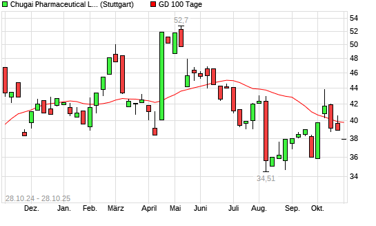 Mit dem Rücksetzer auf 37,58 EUR hat die Chugai Pharmaceutical-Aktie am 27.10.2025 die 100-Tage-Linie nach unten gekreuzt.