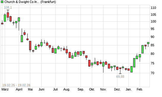 Mit dem Anstieg auf 86,20 EUR hat die Church & Dwight-Aktie (ISIN US1713401024) am 18.02.2026 ein neues 6-Monats-Hoch erreicht und damit den Kurs vom 16.02.2026 eingestellt.