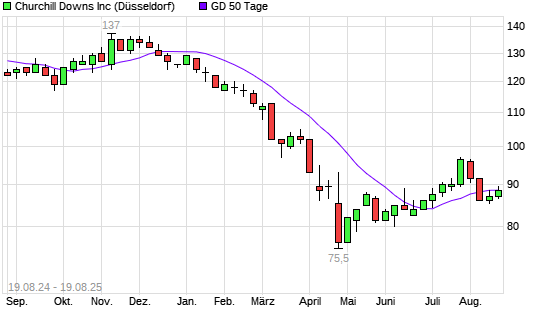Mit dem Rücksetzer auf 88,00 EUR hat die Churchill Downs-Aktie am 18.08.2025 die 50-Tage-Linie nach unten gekreuzt.