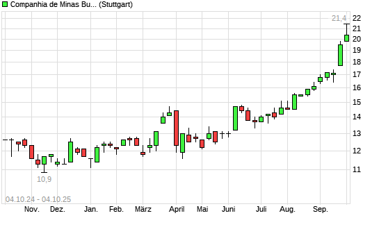 Mit dem Anstieg auf 21,20 EUR hat die Cia de Minas Buenaventura-Aktie (ISIN US2044481040) am 03.10.2025 ein neues 10-Jahres-Hoch erreicht und damit den Kurs vom 02.10.2025 eingestellt.