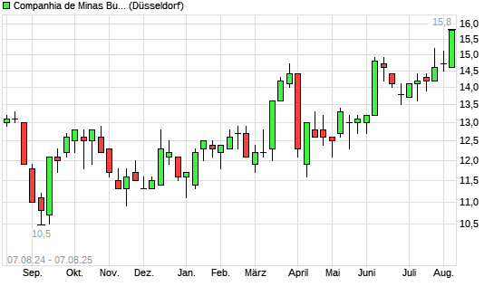 Mit dem Anstieg auf 15,30 EUR hat die Cia de Minas Buenaventura-Aktie (ISIN US2044481040) am 06.08.2025 ein neues 12-Monats-Hoch erreicht und damit den Kurs vom 23.07.2025 eingestellt.