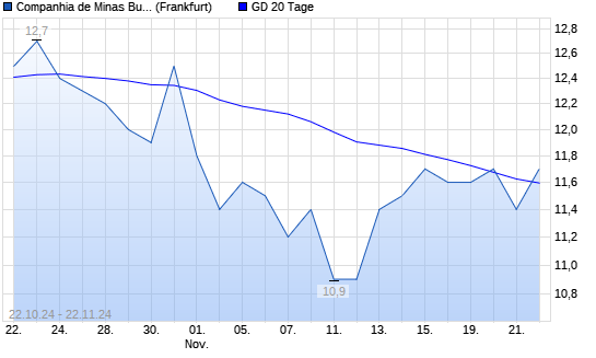 Mit dem Rücksetzer auf 11,40 EUR hat die Cia de Minas Buenaventura-Aktie am 21.11.2024 die 20-Tage-Linie nach unten gekreuzt.