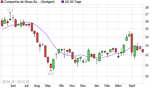 Mit dem Rücksetzer auf 12,70 EUR hat die Cia de Minas Buenaventura-Aktie am 28.04.2025 die 50-Tage-Linie nach unten gekreuzt.Die Cia de Minas Buenaventura-Aktie befindet sich seit dem 14.04.2025 ...weiterlesen