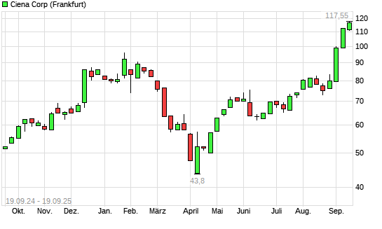 Mit dem Anstieg auf 117,55 EUR hat die Ciena-Aktie (ISIN US1717793095) am 18.09.2025 ein neues 10-Jahres-Hoch erreicht und damit den Kurs vom 17.09.2025 eingestellt.