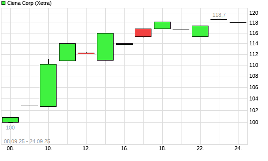 Mit dem Anstieg auf 117,60 EUR hat die Ciena-Aktie (ISIN US1717793095) am 23.09.2025 ein neues 10-Jahres-Hoch erreicht und damit den Kurs vom 18.09.2025 eingestellt.