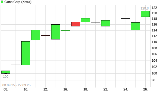Mit dem Anstieg auf 121,90 EUR hat die Ciena-Aktie (ISIN US1717793095) am 26.09.2025 ein neues 10-Jahres-Hoch erreicht und damit den Kurs vom 24.09.2025 eingestellt.