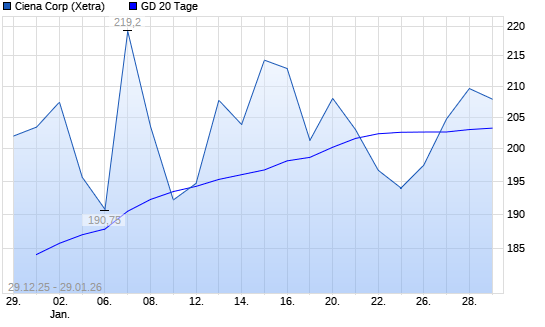 Mit dem Anstieg auf 204,40 EUR hat die Ciena-Aktie am 28.01.2026 die 20-Tage-Linie nach oben gekreuzt.