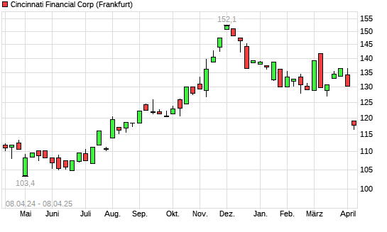 Mit dem Rücksetzer auf 119,00 EUR hat die Cincinnati Financial-Aktie (ISIN US1720621010) am 07.04.2025 ein neues 6-Monats-Tief erreicht und damit den Kurs vom 08.10.2024 eingestellt.