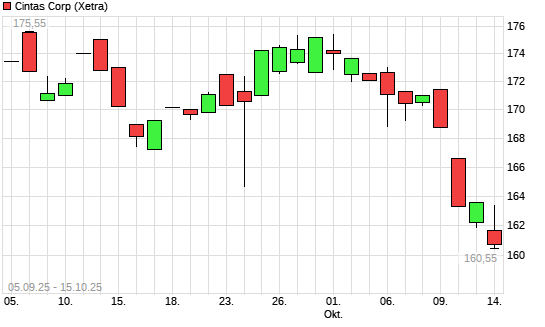 Mit dem Rücksetzer auf 161,90 EUR hat die Cintas-Aktie (ISIN US1729081059) am 14.10.2025 ein neues 12-Monats-Tief erreicht und damit den Kurs vom 13.10.2025 eingestellt.