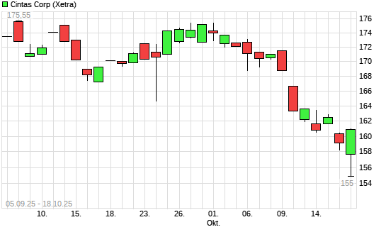 Mit dem Rücksetzer auf 156,00 EUR hat die Cintas-Aktie (ISIN US1729081059) am 17.10.2025 ein neues 12-Monats-Tief erreicht und damit den Kurs vom 16.10.2025 eingestellt.