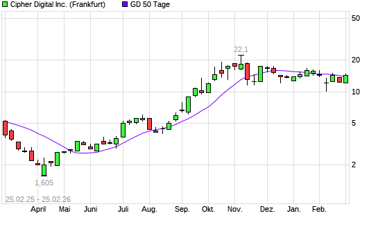 Mit dem Anstieg auf 14,80 EUR hat die Cipher Mining-Aktie am 24.02.2026 die 50-Tage-Linie nach oben gekreuzt.